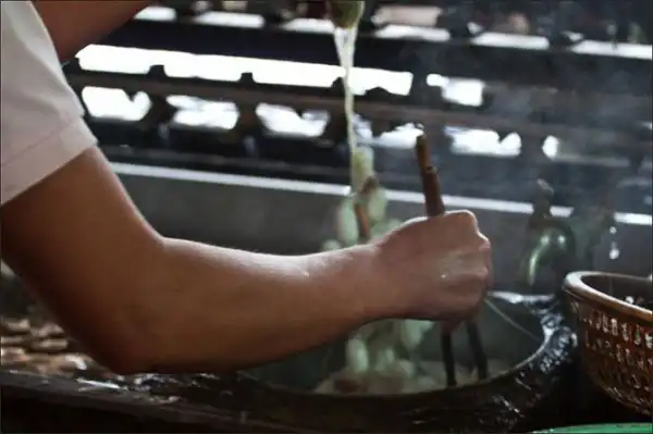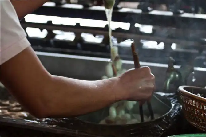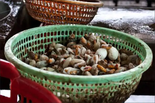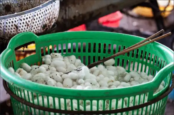Чтобы личинки сварились и умерли. Запах там стоит немного тошнотворный, запах похожий на вареное мясо, только специфичнее. Позже, когда мы купили шарфики, они были пропитаны этим запахом и даже после того, как я его постирала, все равно немного осталось. Вот так выглядят вареные коконы.