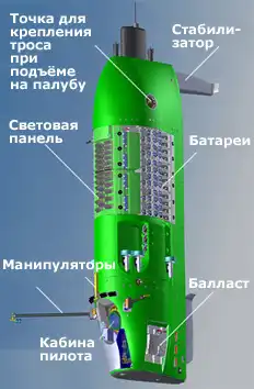 В нижней части подводной машины находится сферический обитаемый отсек. Его внутренний диаметр равен 109 см, толщина стальных стенок – 6,4 см.