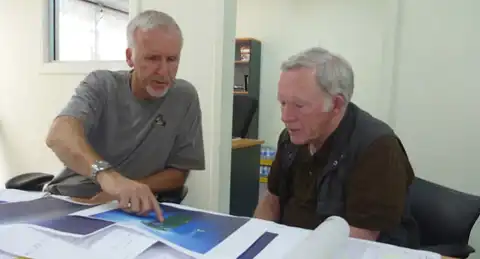 Кэмерон показывает Уолшу материалы экспедиции (фото Deepsea Challenge).