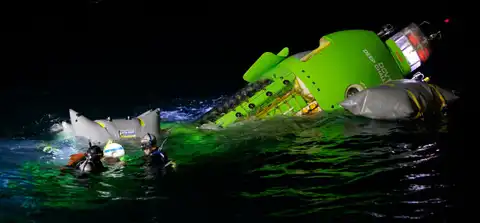 Подготовка к подъёму батискафа из воды (фото Deepsea Challenge, National Geographic).