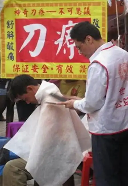 Массажист ритмично опускает нож на тело пациента, отточенные движения позволяют избежать порезов. Несмотря на то, что пациентов предупреждают, что никакой опасности нет, многим не удается сохранить спокойствие. Одни вскрикивают от неожиданности испуга, когда нож опускается на их спину, другие смеются, если от прикосновений ножа становится щекотно. Сеанс длится около получаса, многие ждут окончания, затаив дыхание, и с облегчением вздыхают в конце. Стоимость удивительного массажа – до 15 долларов. «Знатоки» утверждают, что подобная терапия имеет большой потенциал в лечении заболеваний почек и даже способна побороть рак.