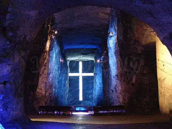 Собор Сипакиры в Колумбии высечен в твердой соляной скале. К алтарю ведет тёмный тоннель. Высота собора – 23 м, вместимость – свыше 10 тыс. человек.Исторически в этом месте была шахта, используемая индейцами для получения соли. Когда необходимость в этом отпала, на месте шахты появился храм.