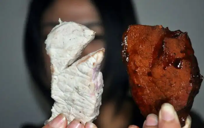 Слева – кусок свинины, замаринованный в соусе с экстрактом, а справа – натуральный поросенок