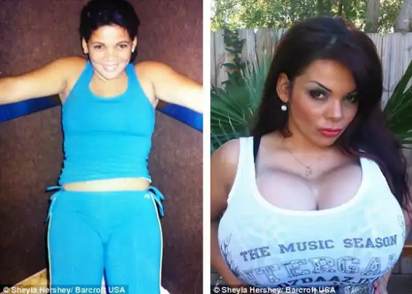 На фото: Шейла Херши после трагической операции по удалению силикона и снова со своей большой силиконовой грудьюОбладательница самой большой груди из Хьюстона, штат Техас, рассказала, что была в восторге от своей прошлой груди, пока она не начала болеть, и у нее не поднялась температура из-за инфекции, попавшей через силиконовые имплантаты.Когда Шейле, которая воспитывает 2-х летнюю дочь Викторию со своим мужем, в экстренном порядке извлекли имплантаты, она собралась покончить жизнь самоубийством, так как у нее появилось ощущение, что она лишилась важной части своего тела.