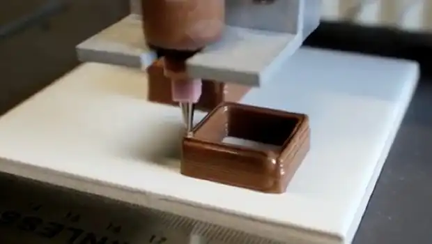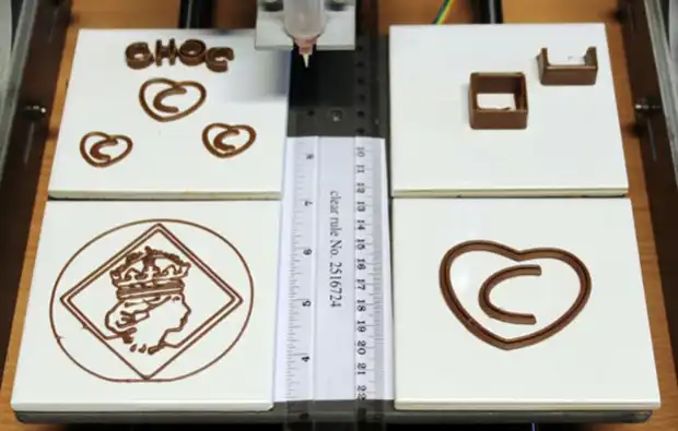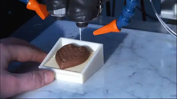 Принтер выдаёт шоколад при помощи маленькой конусообразной насадки и выстраивает его слой за слоем, чтобы сформировать трёхмерные объекты.