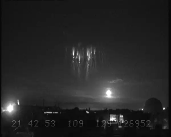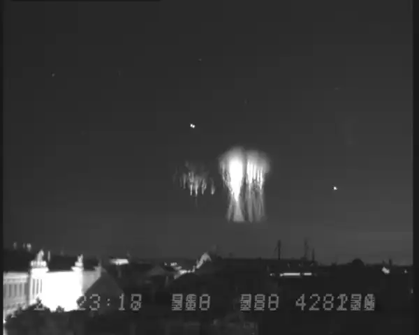 Спрайты над грозой в Канзасе 10 августа 2000, наблюдаемые в мезосфере на высоте 50-90км, как отклик на мощные удары молнии от тропосферных гроз. Спрайты - некое подобие молний, только бьющих не вниз, а вверх.