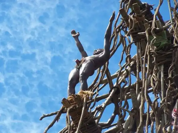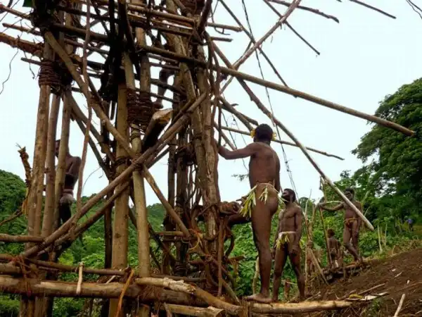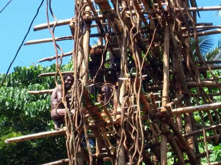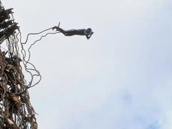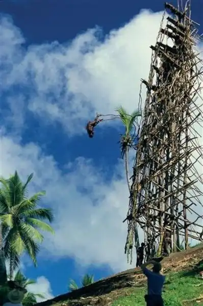 Нырок в землю - это старый ритуал, который практикуют племена на одном из островов Вануату. На высокую башню, которая сделана из дерева, вскарабкиваются мужчины, которые прыгают с 10-метровой высоты, как с современной "тарзанки", только вместо крепкого и проверенного троса - веревка, сплетенная из лоза и лианы. Жуткое зрелище, многие из участников этого опасного ритуала "влетают" головой прямо в землю. Хорошо, что при приземлении есть склон, который спасает некоторых из них от смерти.