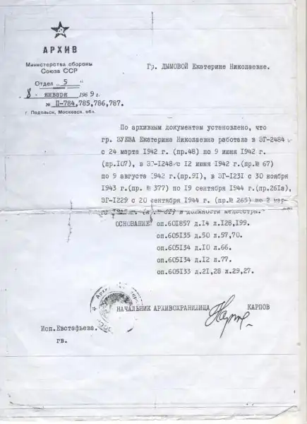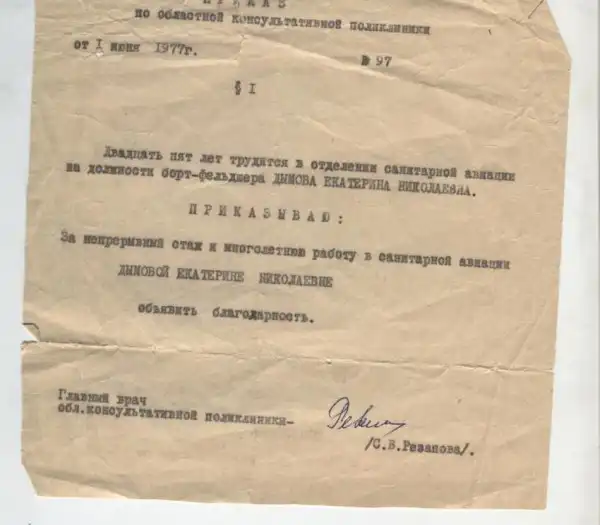Е.Н.: Работать в ОКБ я начала на станции санитарной авиации, а когда здание больницы построили, перешла туда. Всего 35 лет проработала до 1986.
