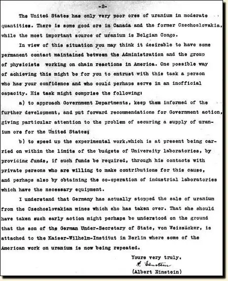 Научные изыскания Эйнштейна-американца сегодня известны гораздо меньше его общественной деятельности. В 1939 году он подписался под обращением к Рузвельту, предупреждавшем о возможности создания Германией атомного оружия. Это стало одной из причин ускорения собственных ядерных разработок США. Самого Эйнштейна (немца, и к тому же леворадикала) к «Манхэттенскому проекту» не допустили, однако во время войны он консультировал ВМФ США. Позже ученый горько сожалел о содеянном, а после бомбардировки Хиросимы написал: «Лучше бы я сжег себе пальцы» (подразумевая обращение к Рузвельту).