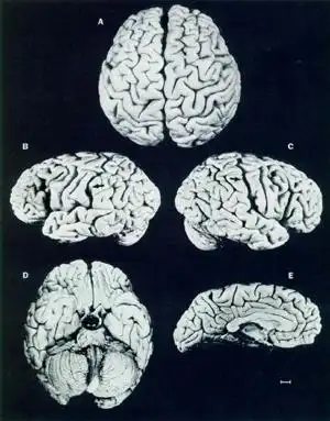 Патологоанатом Томас Харви сохранил мозг Эйнштейна (по разрешению родственников) в формалине, а офтальмолог Генри Абрамс законсервировал глаза ученого. Часть срезов мозга была роздана ученым, а остальные ткани, по некоторым свидетельствам, хранились за холодильником в картонном ящике для сидра. Исследования показали, что объем мозга Эйнштейна находился в пределах нормы, однако латеральная извилина, отделяющая нижнюю теменную область от остального мозга, отсутствовала. Возможно, именно поэтому теменная доля мозга оказалась шире, чем обычно, примерно на 15%. Считается, что она отвечает за пространственные ощущения и аналитическое мышление (сам ученый говорил, что мыслит скорее образами, чем понятиями). Данная аномалия также способна объяснить то, что Эйнштейн до 3 лет якобы вообще не мог говорить.