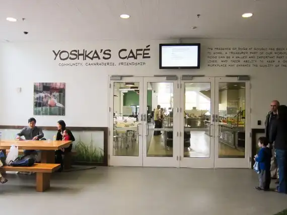 Yoshkas-kafe - то самое кафе, в которое можно зайти с собакой. История названия кафе происходит от имени собаки, которая принадлежала одному из основоположников компании Google. Собака умерла, а владелец долго горевал. В память о ней и назвали кафе.
