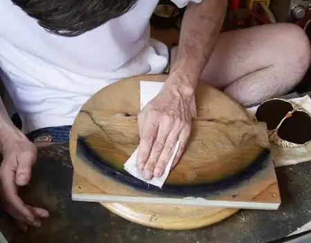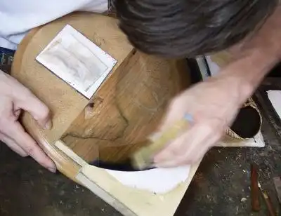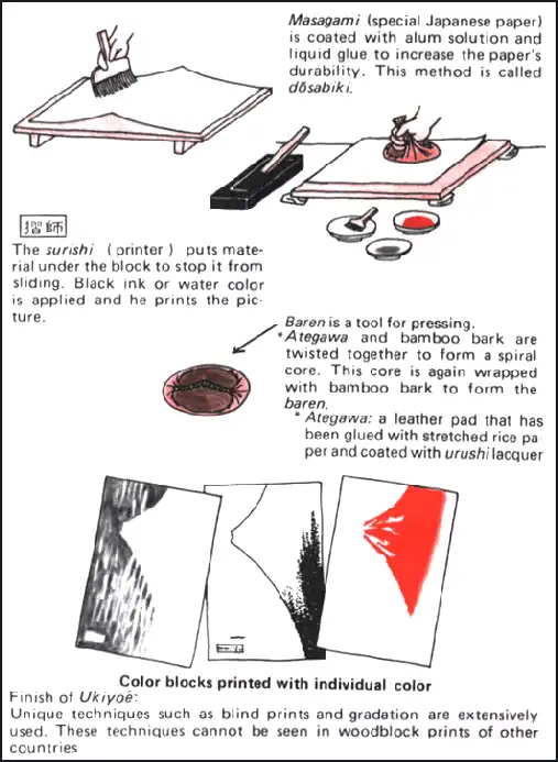 Чуть влажный лист бумаги, наложенный на доску, мастер приглаживал специальным приспособлением в виде круглой подушечки, обтянутой плотной оболочкой ростка бамбука (барэном). Японцы практически не знали печатного станка до XIX века.