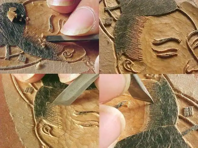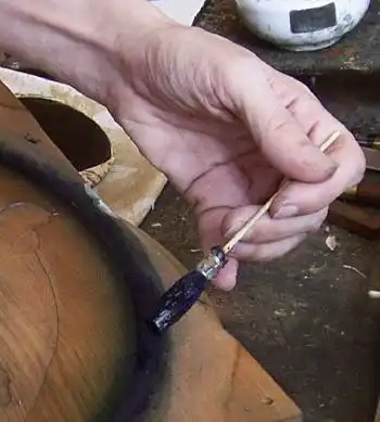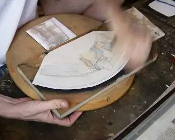 Затем гравер резал по рисунку доску для контурного отпечатка – «ключевую доску», с меткой «кэнто» (по которой и пригонялись все остальные клише). Оригинал при этом уничтожался, поэтому до наших дней дошло так мало авторских рисунков, представляющих собой, по-видимому, предварительные эскизы. Линии должны были быть очень тонкими, не более трети толщины линии рисунка, так как при печати они неизбежно расширялись. Нередко резчики специализировались в какой-нибудь определенной области, например, в изображении людей или животных.