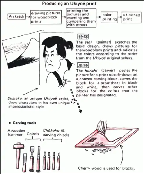 В отличие от европейской авторской гравюры – гравюра укиё-э была результатом коллективного творчества. Каждый из ее участков имел свои тонкости и требовал большой специализации. Художник рисовал черно-белую основу (сита-э) и обозначал расцветку отдельных деталей, резчик переносил картину на доску, а печатник подбирал цвета и переносил изображение на бумагу. Чтобы гравюра стала произведением искусства, было необходимо настоящее творческое содружество этих мастеров. Художник должен был учитывать специфику работы резчика, так как качество линии, в конечном счете, зависело от резчика. Добиваясь виртуозности в работе, резчики вырабатывали свой почерк, который в значительной мере определял стиль гравюры. При большом потоке продукции резчики кооперировались: самые опытные резали лица и прически, их помощники резали менее ответственные линии одежды и тела, а самую простую работу выполняли подмастерья. Общее цветовое решение гравюры во многом зависело от печатника, поскольку обычно художник следил только за самыми первыми оттисками. Важная роль принадлежала также издателю, изучавшему спрос и определявшему тираж. Зачастую именно он задавал тему гравюры и влиял на характер издания, выступая своего рода меценатом талантливых авторов.