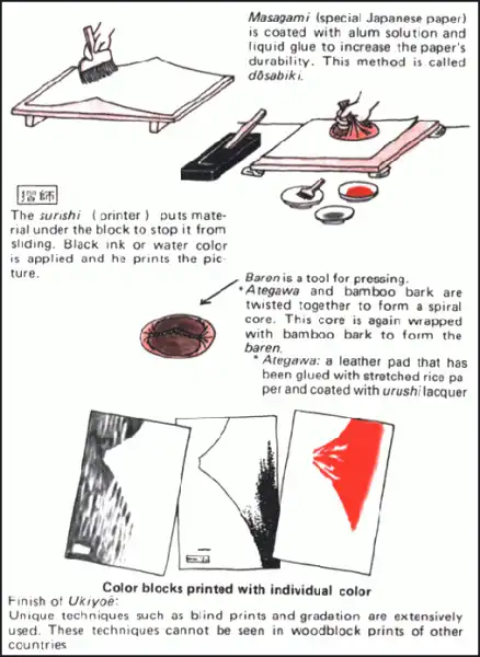 В техническом отношении японская гравюра является высокой печатью. Процесс создания гравюры выглядел следующим образом. Художник делалконтурный рисунок тушью на тонкой, прозрачной бумаге. Гравер наклеивал слегка увлажненный рисунок лицевой стороной на доску продольного распила. Для этого обычно использовалась древесина вишни, иногда груши или японского самшита. Деревья рубили осенью и оставляли лежать всю зиму, весной вывозили и выдерживали два года. Поверхность досок обрабатывалась очень тщательно. Она должна была быть такой гладкой, чтобы две доски при соприкосновении слипались без клея.