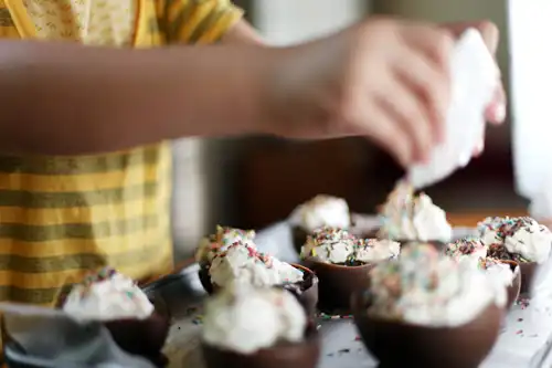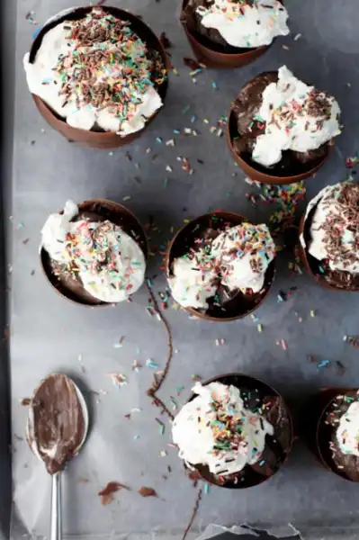 Теперь дело за малым. Наполнить формы десертом. Это может быть мороженное, пуддинг, взбитые сливки, фрукты — тут можно экспериментировать бесконечно!