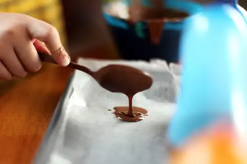 Ложкой ляпаем на поднос шоколадную массу. Заметьте, на подносе — промасленная бумага.