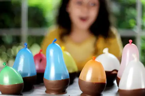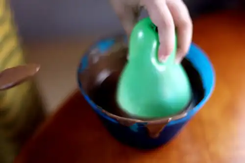 Итак, надуваем столько воздушных шариков, сколько будет порций десерта. Плюс парочку запасных Только не стоит надувать их до полного размера, нам нужны небольшие объемы — размером с будущий десерт. Можно для утяжеления формы в шарик налить воды и немного надуть.