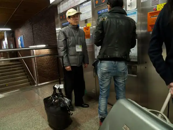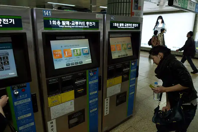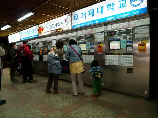 Кассиров в корейском метро нет. Купить билетики можно только в терминалах самообслуживания.