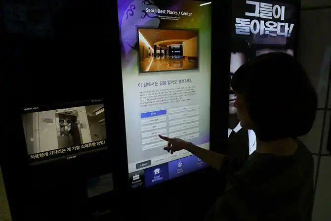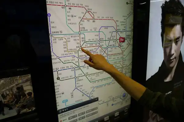 Ориентироваться в корейском метро довольно просто. На каждой станции стоят вот такие тачскрин-мониторы. Можно подобрать свой маршрут и даже посмотреть, какие достопримечательности есть на каждой станции. Из каждой станции может быть до 10 выходов. Но все они обозначены номерами, поэтому потеряться невозможно. Просто договариваетесь: «Встречаемся у 5-го выхода». Очень удобно, не нужно ничего подолгу объяснять. Пятый выход, всё!