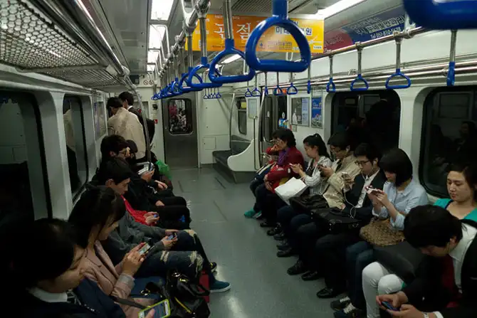 90% пассажиров корейского метро поглощены своими гаджетами. Смартфоны есть у всех слоёв населения. Молодые сидят в соцсетях, а тётушки смотрят телек. Для корейцев смартфоны вместе с контрактом стоят очень дёшево и позволить их себе может каждый.