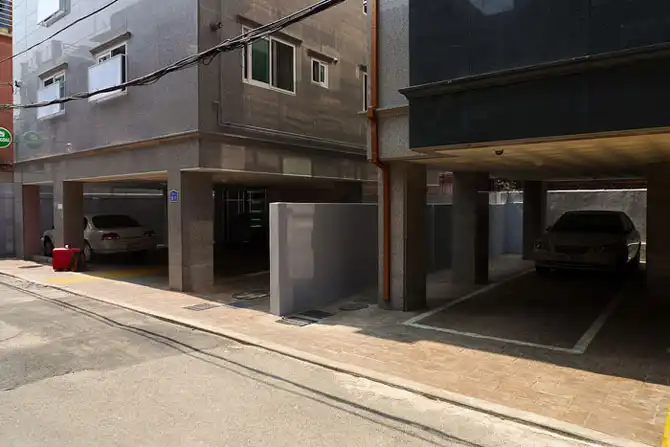 Вот таким образом в жилых кварталах организованы парковочные места. Здание стоит на балках, и весь первый этаж – это подъезд с парковкой. Решение очень грамотное, так как экономит место, улицы в таких районах узкие, и оставлять там машину не представляется возможным.