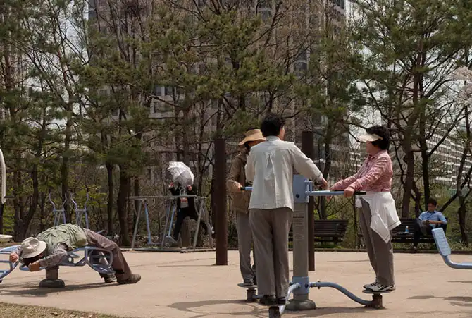 На многочисленных спортивных площадках занимаются в основном люди в возрасте. Поэтому неудивительно, что люди, которым за 50, очень активны. Занимаются спортом, путешествуют, лазают по горам и так далее. Корейцы следят за собой. Все выглядят очень прилично, мы не видели безобразно толстых корейцев, грязных, неряшливо одетых людей, с которыми неприятно было бы находиться рядом.