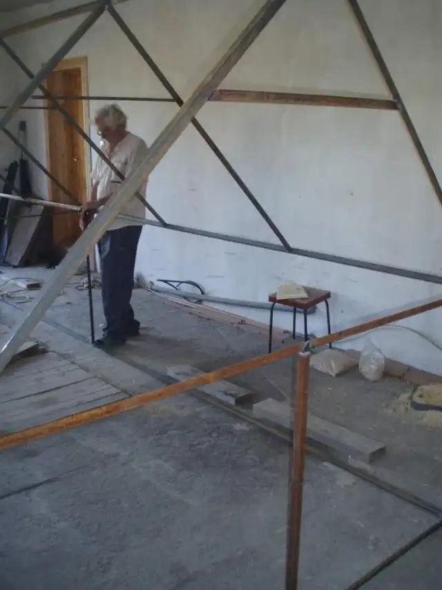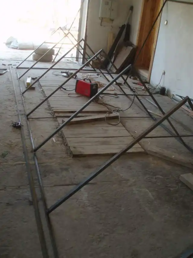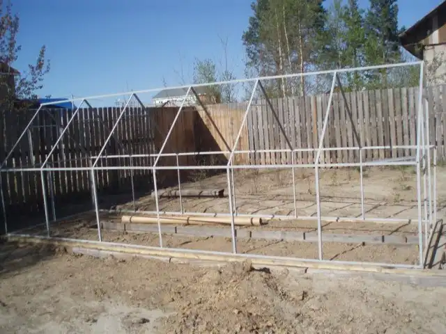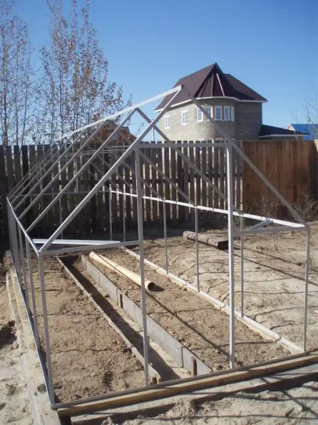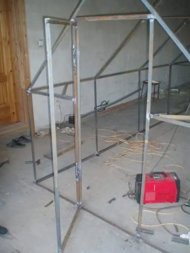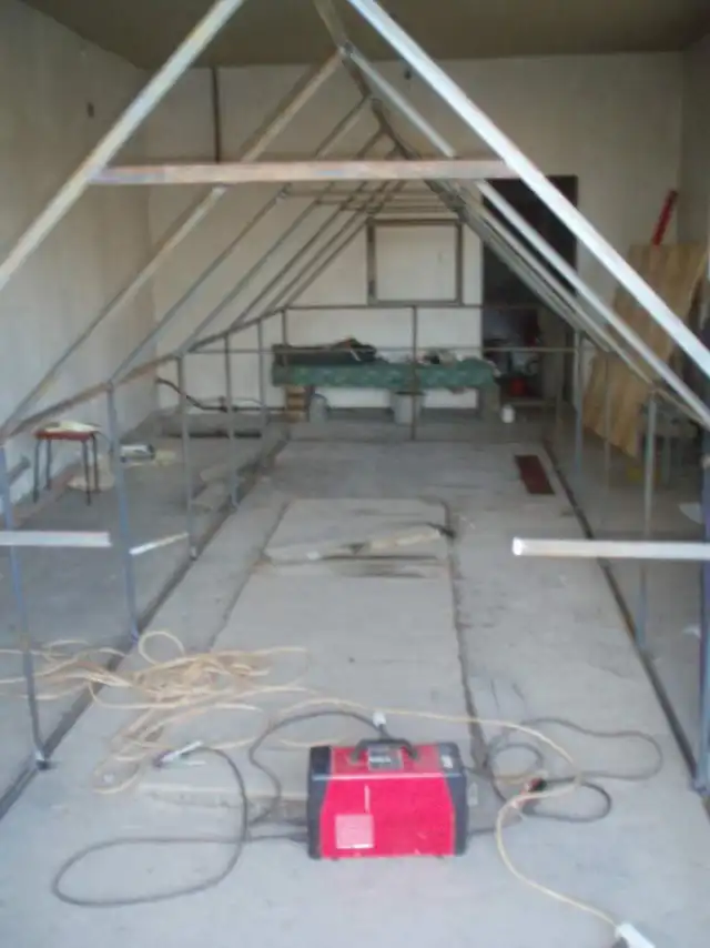 На следующий день, суббота. Просверливаем по всему каркасу дырки. Для крепления покрытия теплицы.