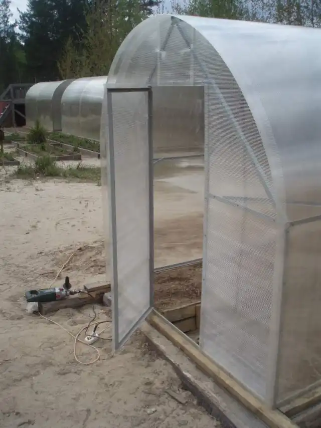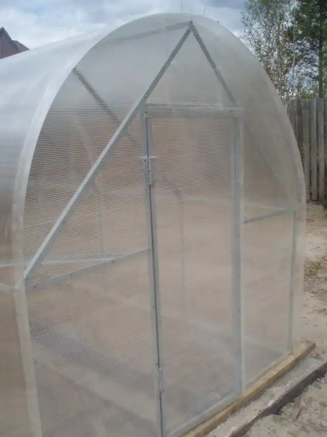 Обратите внимание на уголок внутри теплицы. По углам с двух сторон. Сделали для полочек. Дверь готова.