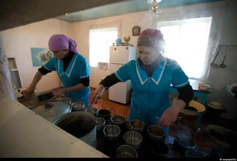 35. Ближе к полудню в лагере готовится обед. Стоит он 100 тенге, ужин предоставляется бесплатно. Поварихи аккуратно разливают обед по термосам