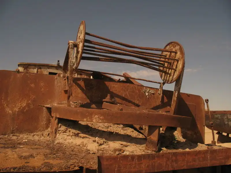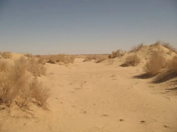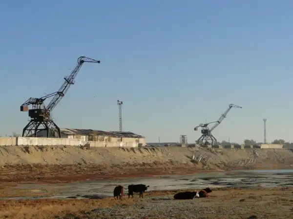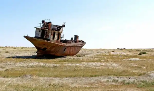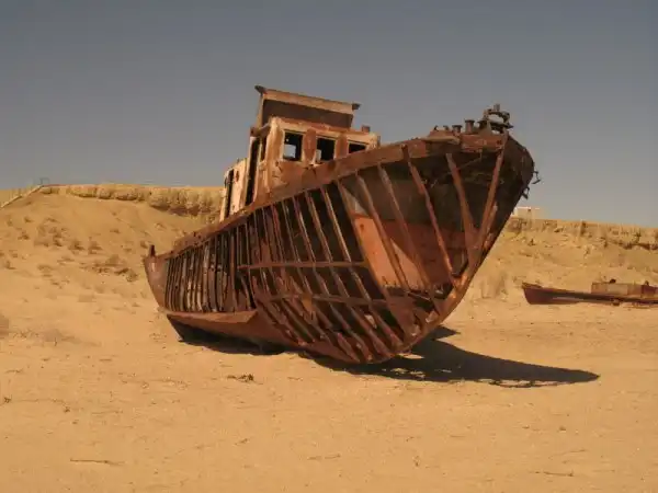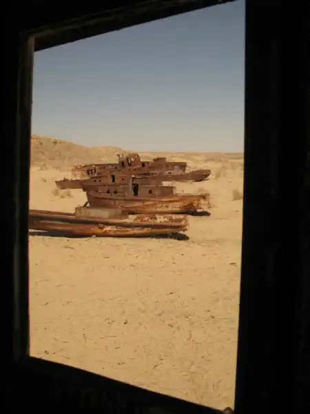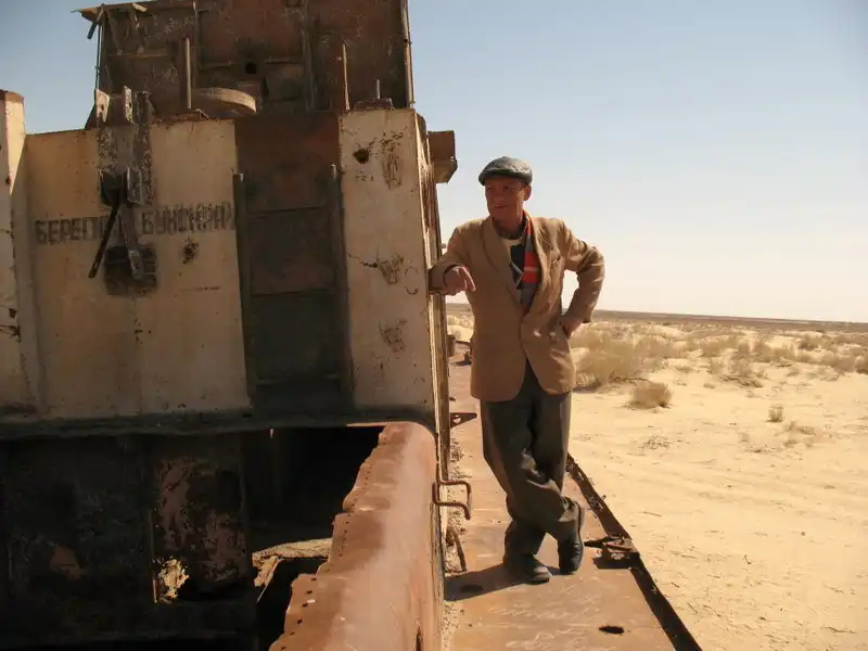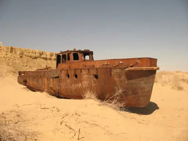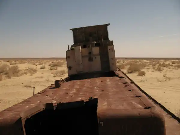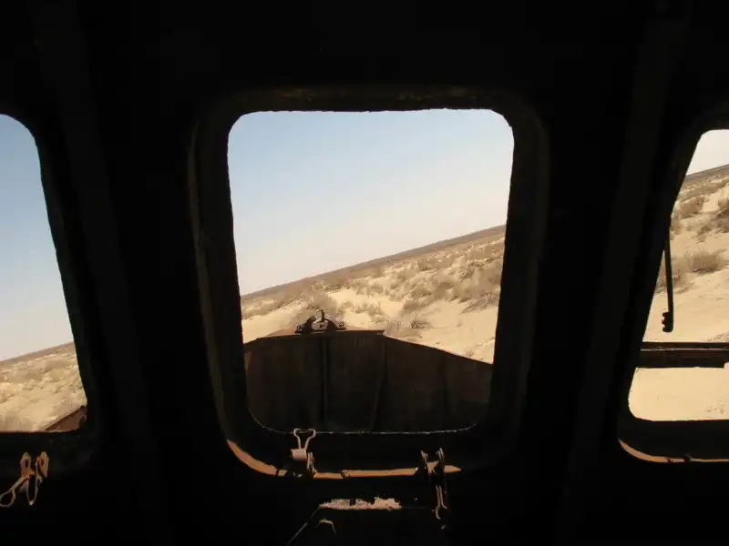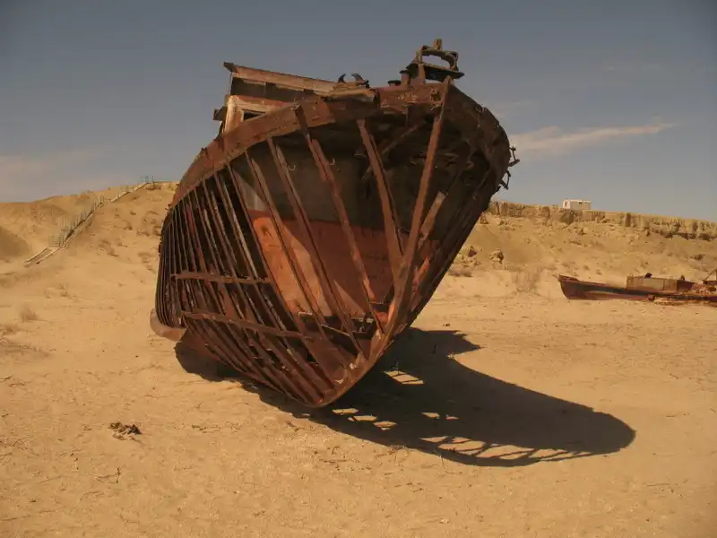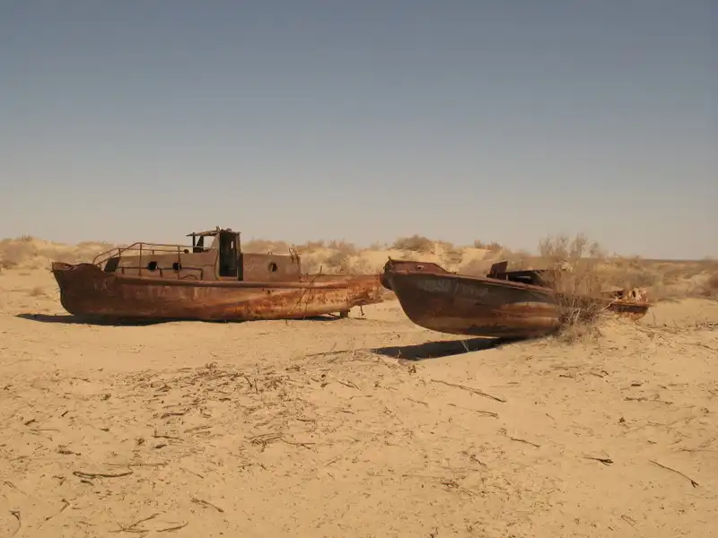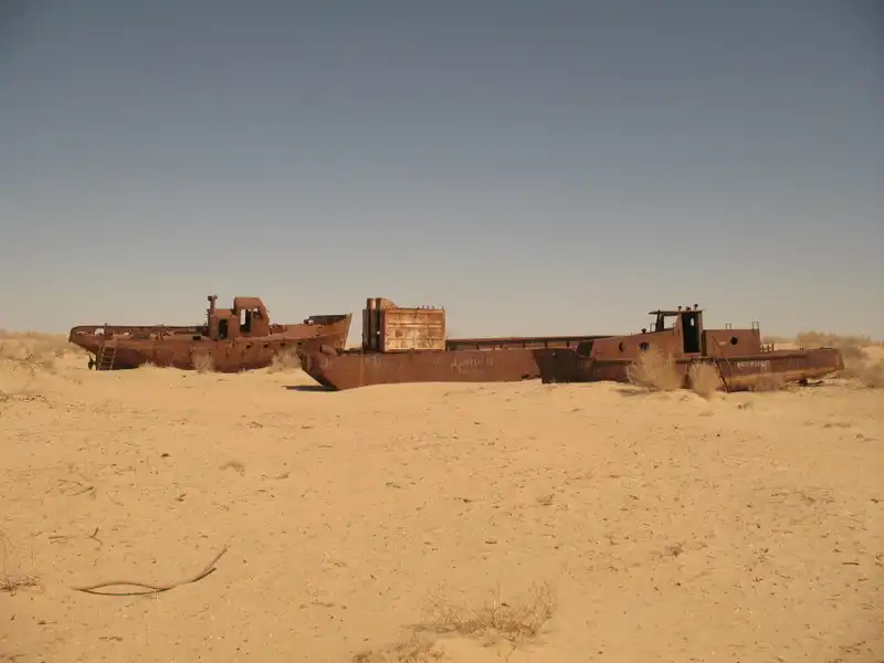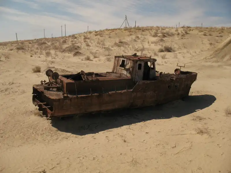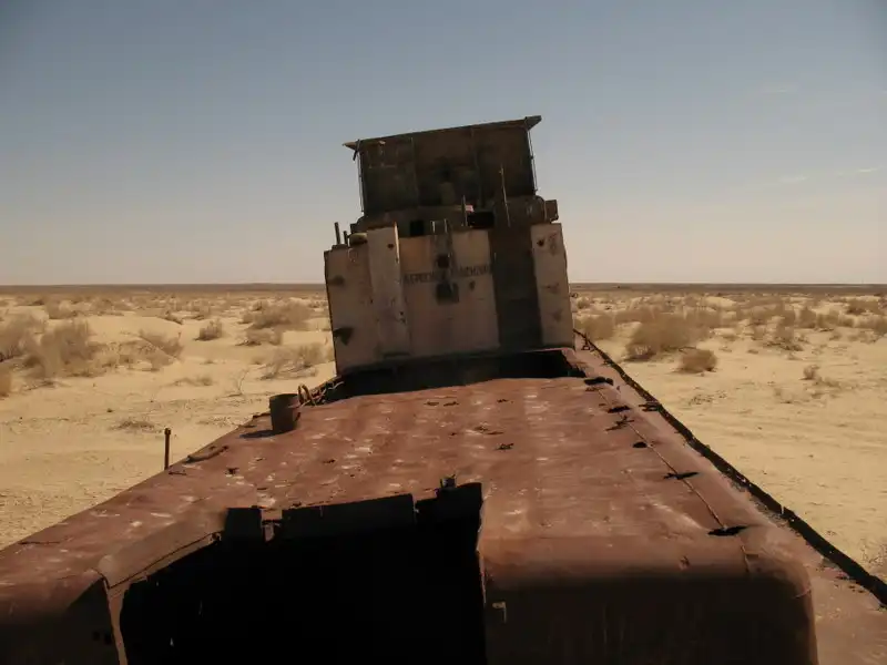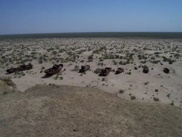 В настоящий момент высыхающее Аральское море ушло на 100 км от своей прежней береговой линии возле города Муйнак в Узбекистане.