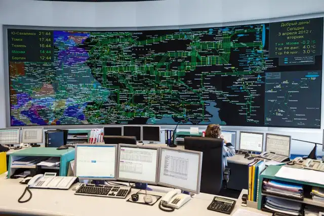 14:44. А это «сердце» «Газпрома» — диспетчерский зал Центрального производственно-диспетчерского департамента. Пульт управления газовыми потоками. Сюда стекается информация со всей Единой системы газоснабжения России. Работа здесь кипит круглосуточно.