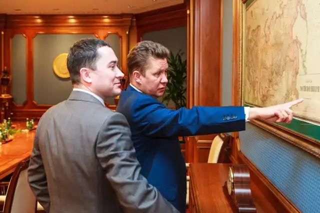 21:45. В коридоре Алексей Миллер со своим пресс-секретарем Сергеем Куприяновым заводит оживленную беседу около старинной карты Российской империи. Мне кажется, что он даже рад сделать краткий перерыв в работе. Как потом рассказал Сергей, его шеф на работе — с раннего утра и до позднего вечера. В этот день у него до 9 вечера проходило какое-то важное совещание.
