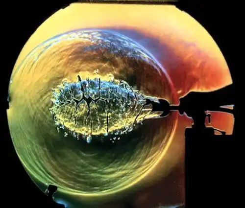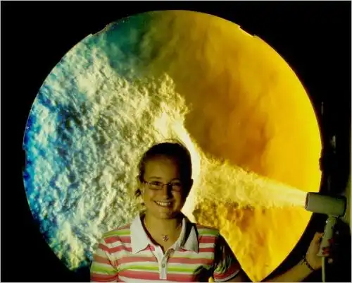 Однако прошло более 30 лет, прежде чем световозвращающий экран впервые появился в шлирен-фотографии. Леонард М. Вайнштейн, физик из Исследовательского центра NASA им. Лэнгли, ввел в традиционную шлирен-схему еще одно изменение - он нанес на световозвращающее полотно вертикальные черные полосы, превратив его (при освещении расходящимся пучком) в виртуальный набор щелевых источников. Вместо ножа Фуко в соответствующем месте схемы исследователь расположил негативный растр -решетку чередующихся прозрачных и непрозрачных полос, отсекающих неискаженный "лишний свет". В результате были получены полномасштабные изображения невидимых ранее явлений - ударных волн от взрывов, конвекционных потоков от промышленного оборудования и людей.