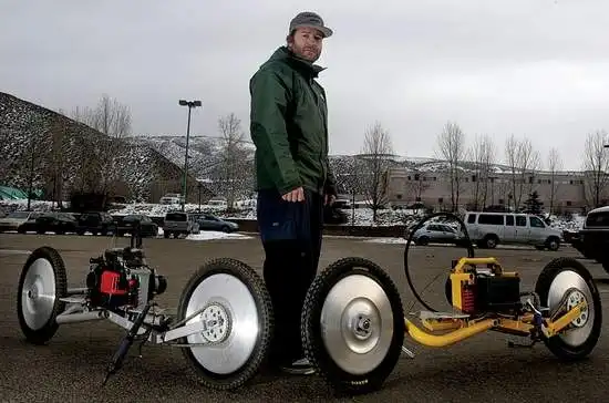 Изобретатель этой дикой машины считает, что освоить её легче лёгкого. Более того – благодаря колёсному аппарату якобы можно научиться ездить на сноуборде (фото с сайта gizmag.com).