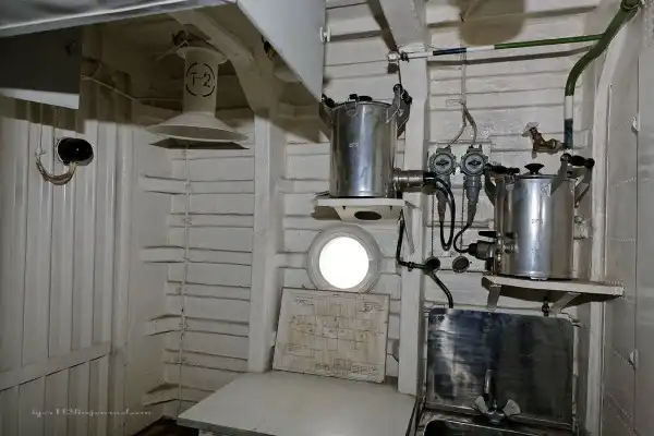 А это уже вид изнутри: обратите внимание на морскую веревку с узлами, для покидания этого места в случае аварии