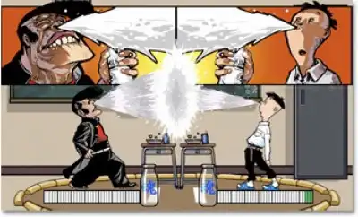А эта игра называется «Плевание молоком из носа». Здесь вы соревнуетесь в меткости и силе струи с предыдущим посетителем. Результаты (ваши и соперника) выводятся на экран и компьютер всё время орёт на вас, требуя «поднажать»: