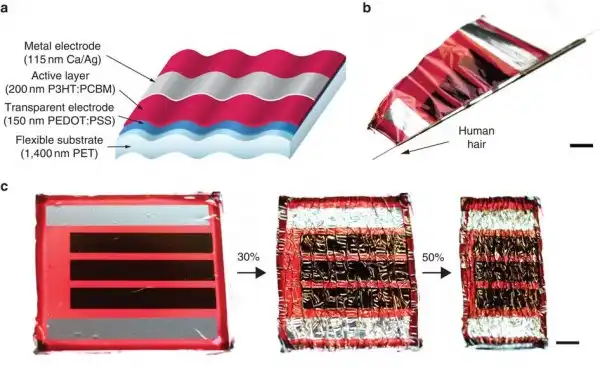 Группа учёных из Австрии и Японии разработала органическую солнечную батарею на полимерной подложке. От похожих проектов-предшественников её отличает экстремальная «изящность» всех слоёв и, как следствие, необычайная гибкость. Последнюю авторы устройства продемонстрировали несколькими способами. В частности, они обернули образец СБ вокруг человеческого волоса (радиус сгиба составил 35 мкм).