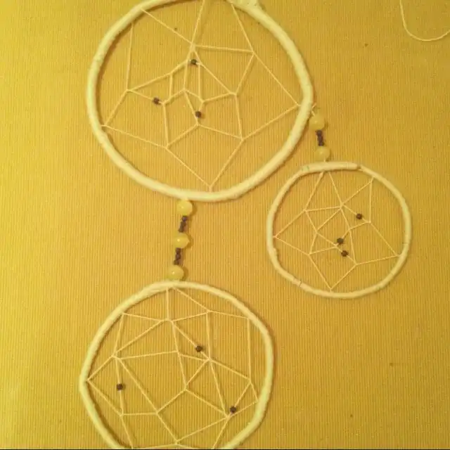 Для его создания нам потребуется 5 веточек ивы, клубок ниток, бусинки, 11 перьев и ножницы.