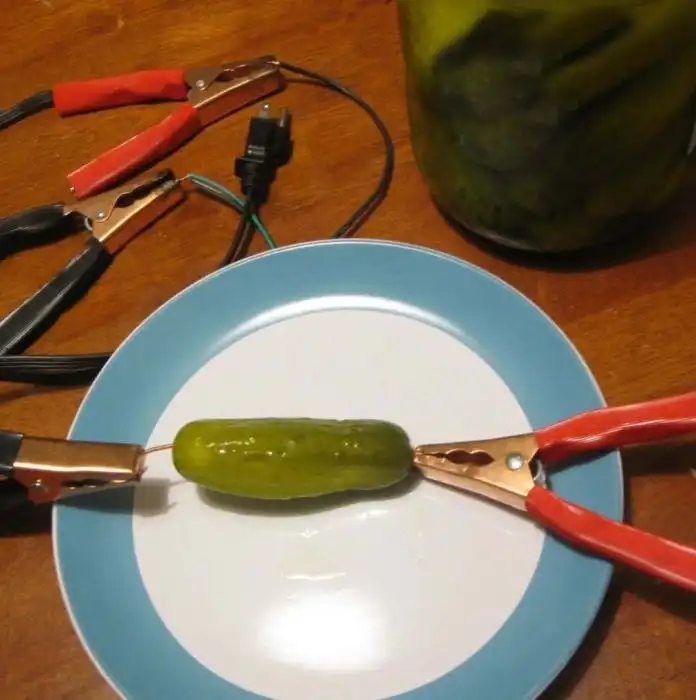 5. Подсоедините зажимы к медным окончаниям торчащим из огурца
