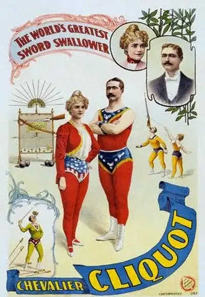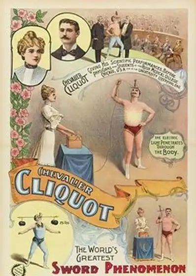 Ну а самым известным из американских глотателей меча стал артист Фред Маклоун, выступавший под псевдонимом «Шевалье Клико» с 1878 года по начало прошлого столетия. Господин Маклоун умели заглатывать-с до 19 мечей одновременно, или 22-дюймовый штык, или меч, утяжеленный гантелями. Учитывая то, что все перечисленные трюки были придуманы до него, отметим, что Шевалье Клико был первым в мире артистом, проглотившим светящуюся электрическую лампочку. Которая якобы продолжала гореть в его животе.