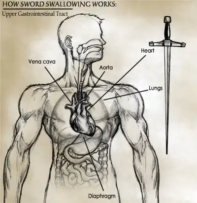 После тренировок у шпагоглотателя притупляются ощущения в глотке и пищеводе. Циркач начинает учиться задирать голову так, чтобы глотка и пищевод уложились в прямую линию. Только при особенной, неповторимой осанке меч или шпага входит в пищевод, не касаясь чувствительных участков тракта, и даже в желудок фокусника.