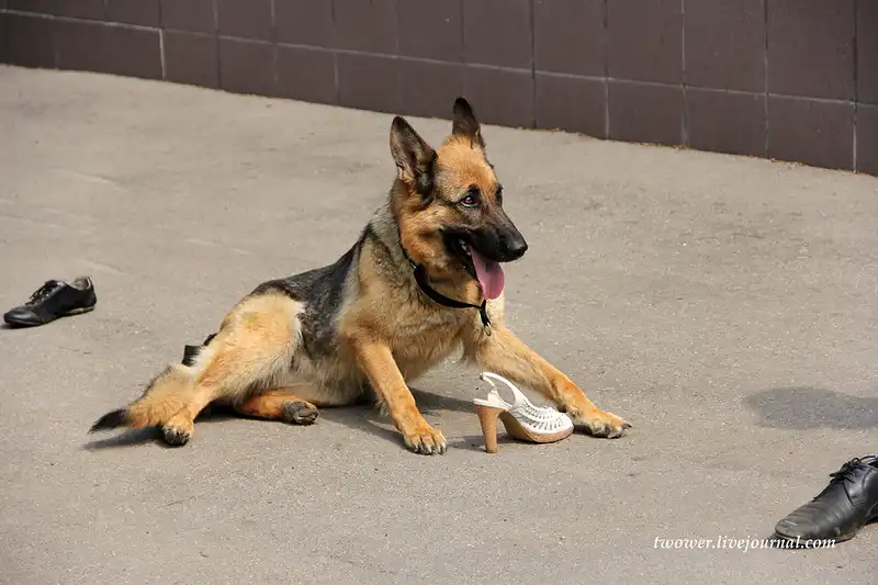 Поиск искомого предмета по запаху. Снимаем туфли, одну из которых ставим в ряд с другими, а вторую даем понюхать собаке