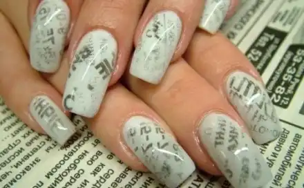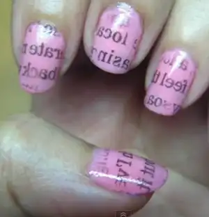 3. Газета. Любая, лишь бы отпечатывалась. Можно цветную. Можно распечатать рисунок на принтере. Вырезаем кусочки газеты, по размеру равные ногтям. Прикладываем их на ноготь.