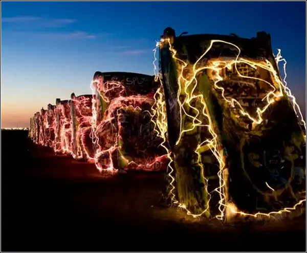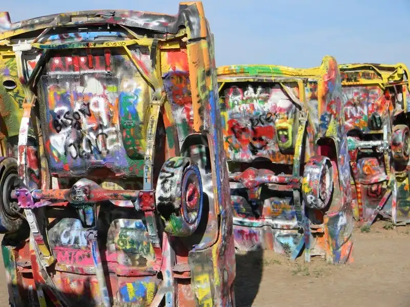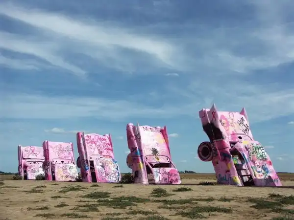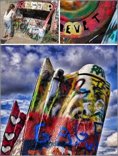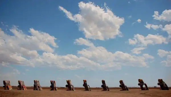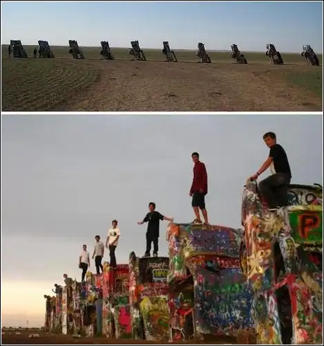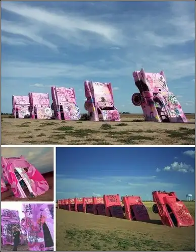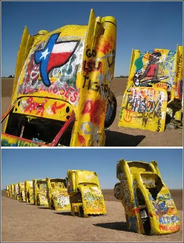 Перед всеми, кто едет по трассе 40 рядом с техасским городом Амарилло, открывается любопытная картина: чуть в стороне от дороги на одинаковом расстоянии друг от друга в землю вкопаны десять автомобилей. Это - знаменитое Ранчо Кадиллаков, и самое лучшее, что вы можете сделать, это съехать с трассы, взять в руки баллончик с краской и вывести на кузове одной из машин нечто вроде "Здесь был Вася".