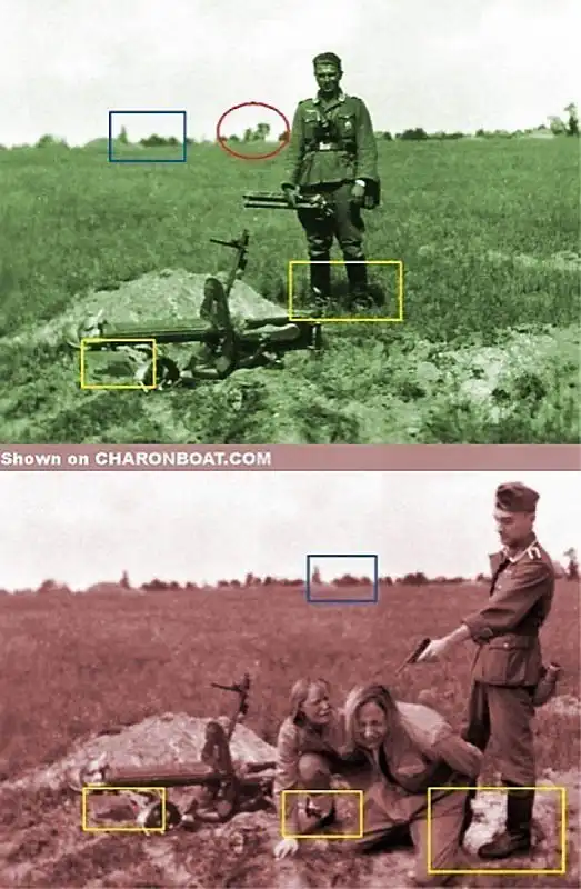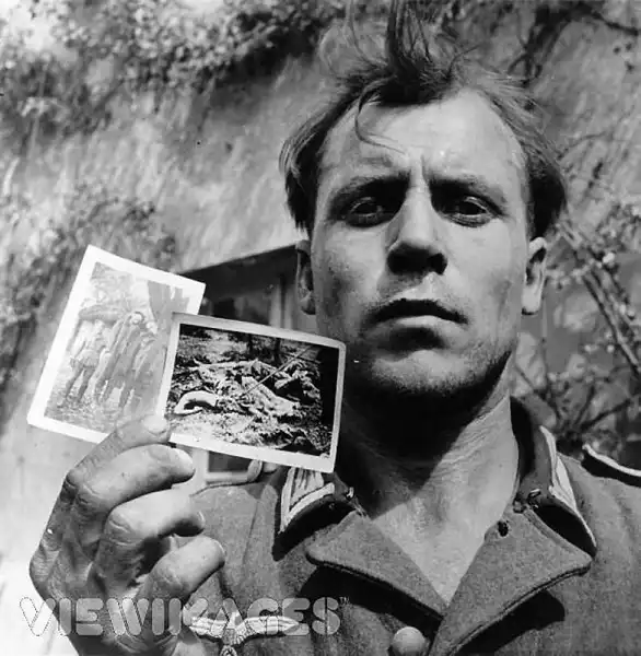 Пленённый немецкий солдат, показывает фотографии, на которых он убивал и насиловал. В действительности на фотографиях, были его дети. А современный и явный фотошоп, видно не вооружённым глазом.