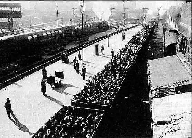 Оригинальное фото Федеральной Администрации Железной дороги. Подписано: «Грузовые поезда, полные беженцев, 1946. Переполненный грузовой поезд, направляющийся в Рурскую область. На заднем плане — двухэтажный поезд в Любек.» Фотоархивы Федеральной Администрации Железной дороги в Гамбурге, утверждают, что это — поезд с немецкими беженцами, стоящий в Гамбурге в 1946. Нетронутое оригинальное фото висит на Главной Станции Гамбурга.