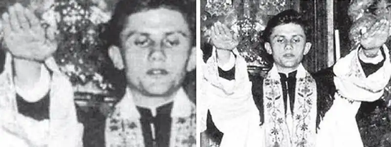 Папа Бенедикт XVI. Практически всегда светят левую фотографию. Точнее часть правой. Две поднятые руки вверх, по видимому часть какого-нибудь церковного ритуала.