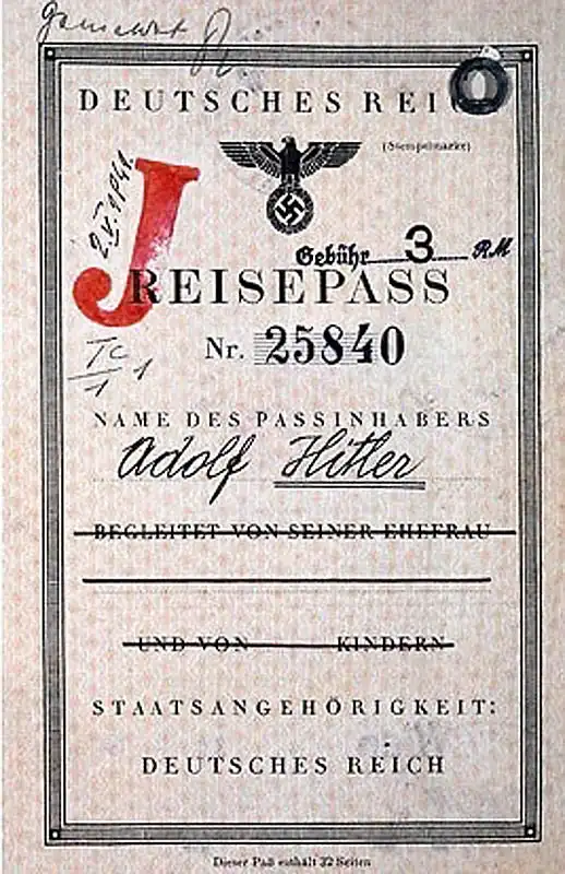 . Фальшивый паспорт на имя Адольфа Гитлера, изготовленный офицерами британской разведки и проштампованный в Вене в 1941 году. Большая красная «J» означала, что владелец паспорта — еврей. Эти документы — из архива существовавшей в годы Второй мировой войны организации по саботажу и подрыву, называвшейся Специальная оперативная администрация (СОА). В числе фальшивок, изготовленных СОА, — виза, позволявшая Гитлеру жить в Палестине, бывшей в то время подмандатной британской территорией.