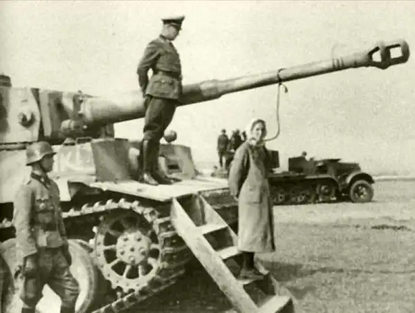 Классика советского фото монтажа. Не задумывался над этой фотографией только слепой. Типичная подпись под этой фотографией: «Член айнзатгруппы целится в упор в мать с ребёнком. Женщинам часто приказывали прижимать детей к себе, чтобы один выстрел достигал двойного эффекта». (This Century).